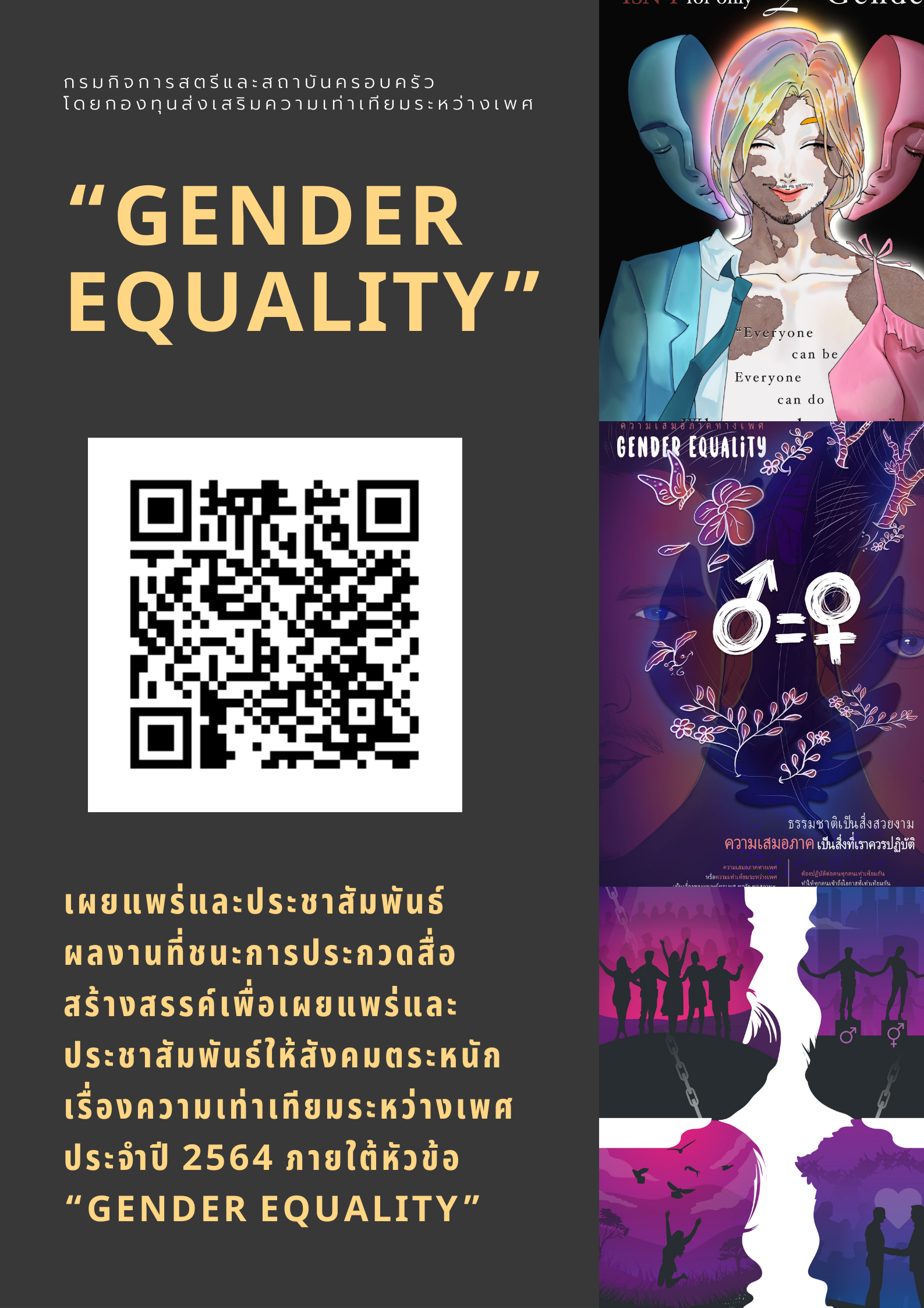 กรมกิจการสตรีและสถาบันครอบครัว โดยกองทุนส่งเสริมความเท่าเทียมระหว่างเพศเผยแพร่และประชาสัมพันธ์ผลงานที่ชนะการประกวดสื่อสร้างสรรค์เพื่อเผยแพร่และประชาสัมพันธ์ให้สังคมตระหนักเรื่องความเท่าเทียมระหว่างเพศ ประจำปี 2564 ภายใต้หัวข้อ “Gender Equality”