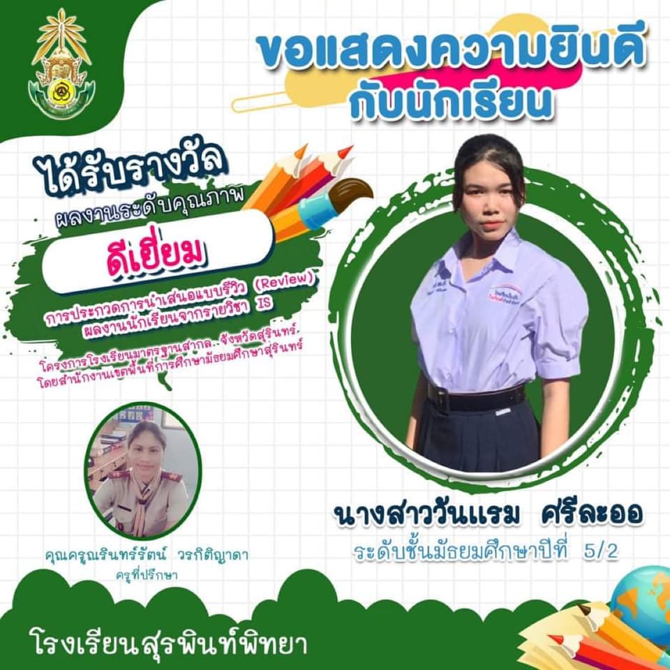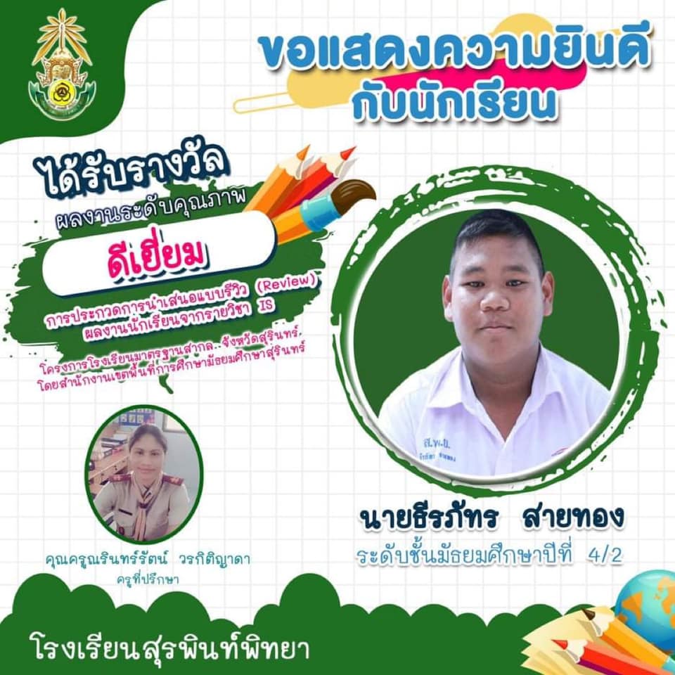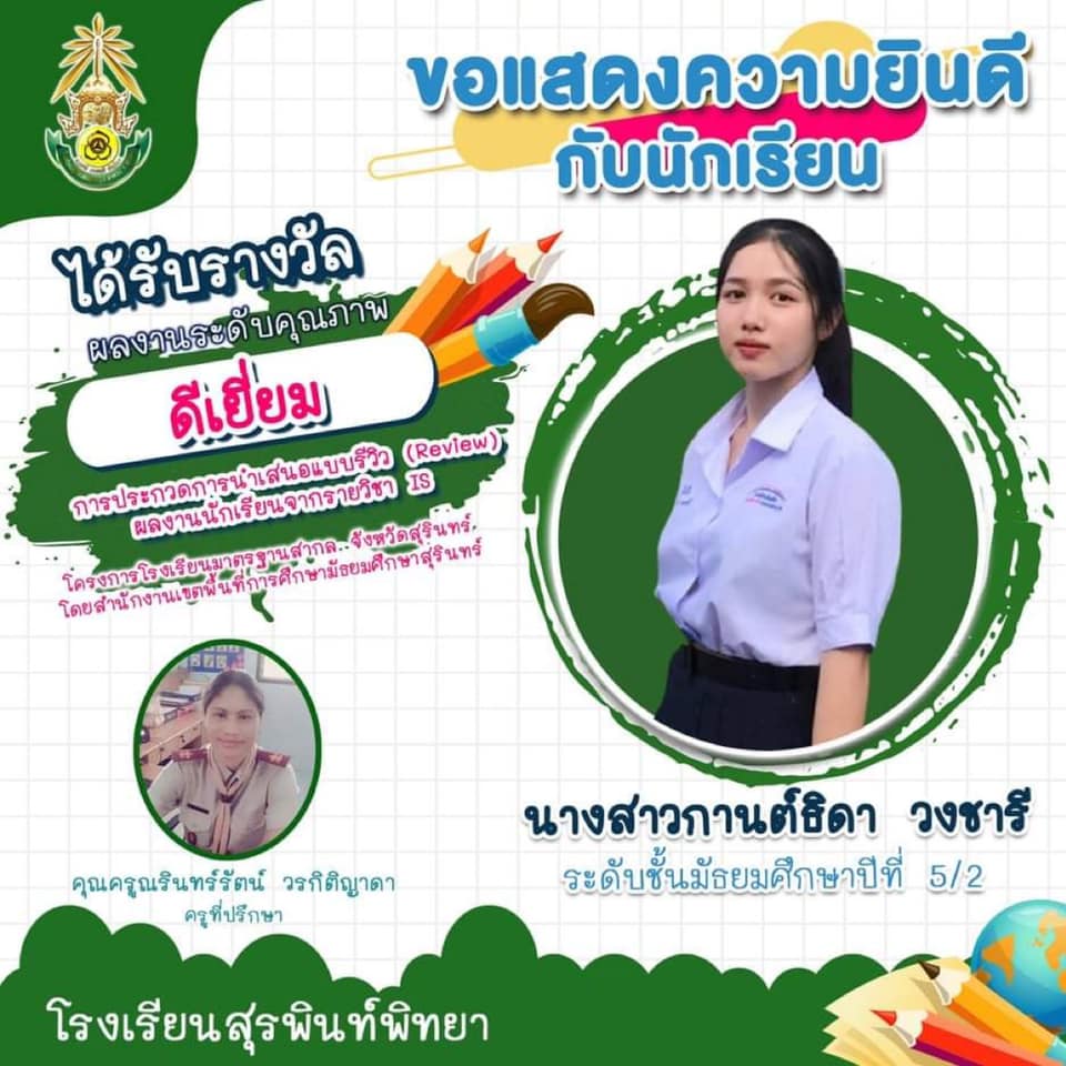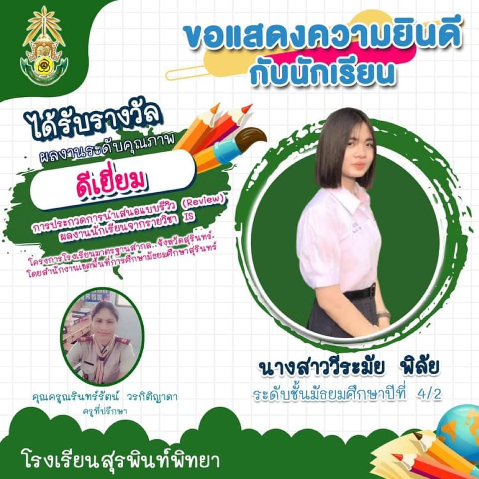 โรงเรียนสุรพินท์พิทยาขอแสดงความยินดีกับนักเรียนและคุณครูที่ได้รับรางวัลผลงานระดับคุณภาพยอดเยี่ยม (Excellent) การนำเสนอผลงานนักเรียนจากรายวิชา IS (โรงเรียนมาตรฐานสากล)
