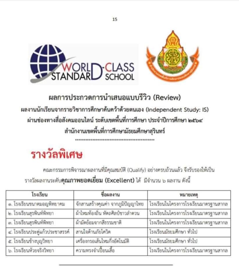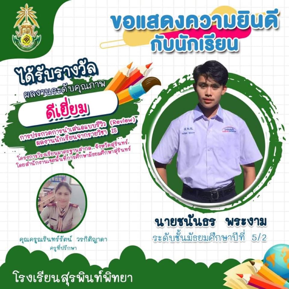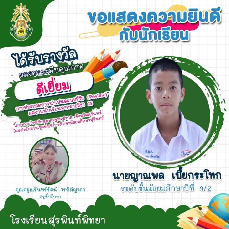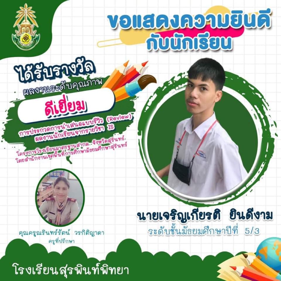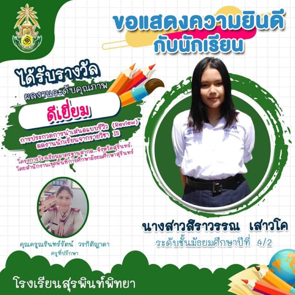 โรงเรียนสุรพินท์พิทยาขอแสดงความยินดีกับนักเรียนและคุณครูที่ได้รับรางวัลผลงานระดับคุณภาพยอดเยี่ยม (Excellent) การนำเสนอผลงานนักเรียนจากรายวิชา IS (โรงเรียนมาตรฐานสากล)