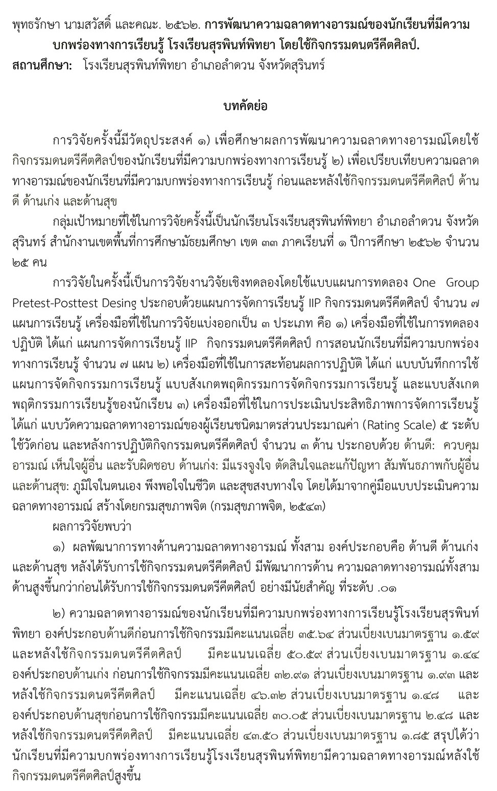 ชื่องานวิจัย "การพัฒนาความฉลาดทางอารมณ์ของนักเรียนที่มีความบกพร่องทางการเรียนรู้ โรงเรียนสุรพินท์พิทยา โดยใช้กิจกรรมดนตรีคีตศิลป์" |
